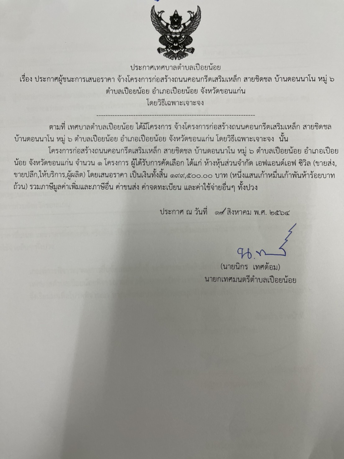 ประกาศผู้ชนะการเสนอราคาโครงการก่อสร้างถนนคอนกรีตเสริมเหล็ก สายชิดชล บ้านดอนนาโน หมู่ 6 ตำบลเปือยน้อย อำเภอเปือยน้อย จังหวัดขอนแก่น โดยวิธีเฉพาะเจาะจงลงข่าว: 19/08/2564